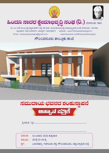 ಆತ್ಮೀಯರೇ, ಹಿಂದೂಸಾದರ ಕ್ಷೇಮಾಭಿವೃದ್ಧಿ ಸಂಘ, ಬೆಂಗಳೂರು ವತಿಯಿಂದ ಮತ್ತು ಗೌರಿಬಿದನೂರು ತಾಲ್ಲೂಕು ಸಮಿತಿ ಉಸ್ತುವಾರಿಯಲ್ಲಿ ಗೌರಿಬಿದನೂರಿನ ಇಡಗೂರು ರಸ್ತೆಯಲ್ಲಿ ನೂತನ ಸಮುದಾಯ ಭವನದ ಶಂಕುಸ್ಥಾಪನೆ ಕಾರ್ಯಕ್ರಮಕ್ಕೆ ಆತ್ಮೀಯ ಆಹ್ವಾನ... ಸ್ಥಳ : ವೀರಂಡಹಳ್ಳಿ,ಇಡಗೂರು ರಸ್ತೆ, ಗೌರಿಬಿದನೂರು. ಸಮಯ : ಶುಕ್ರವಾರ 16.01.2026 ರಂದು ಬೆಳಿಗ್ಗೆ 10.30 ಕ್ಕೆ
